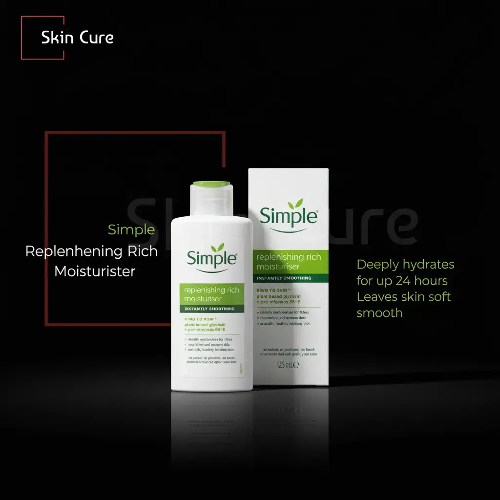 Achieve happy, hydrated skin with Simple's Replenishing Rich Moisturiser! 💧 Enjoy 24-hour moisture and a soft, smooth feel.